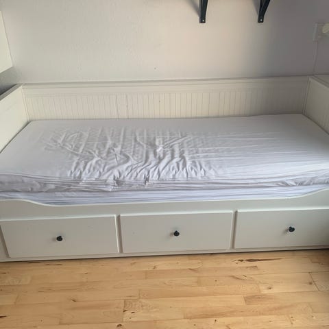 God og funktionel udtræksseng med tre opbevaringsskuffer. Der medfølger to madrasser samt en rullemadras. begge madrasser har nogle skjoldpletter, dog kan betræk vaskes på begge. Den har været benyttet af en pige på nu 10 år, og den har aldrig været tisset i. Som vist på billederne, har den nogle afslag i lakken samt lidt skader efter vand fra glas der har stået på. Den er fra ikke-ryger hjem med lille hund.