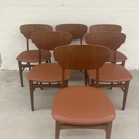 9 stole sælges samlet. Stolene er gjort istand, vasket, slebet, olieret , alt det gamle betræk er fjernet. Nyt koldskum og nyt kunstlæder til sidst. Pris pr stk 550kr , . Stolene står lige nu ved 7470 Hagebro.