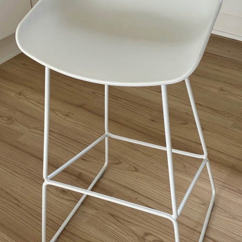 Hay 2 stk barstole søger nyt hjem 2 hvide med træben. De 2 grå er solgt.