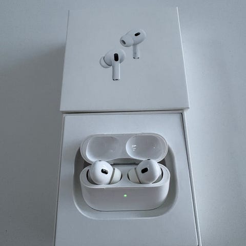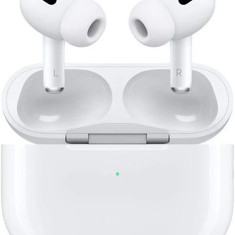 Apple AirPods Pro 2. gen trådløse høretelefoner i hvid farve. Inkluderer opladningsetui og opladningskabel samt nye propper til ørerne (2 sæt).