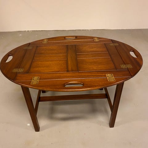 Sofabord med massiv mahogny bordplade (40 mm) og stel i børstet stål.