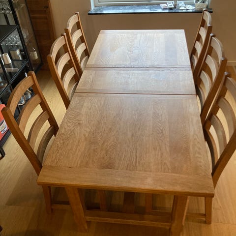 Sæbebehandlet bøgebord og 6 stole