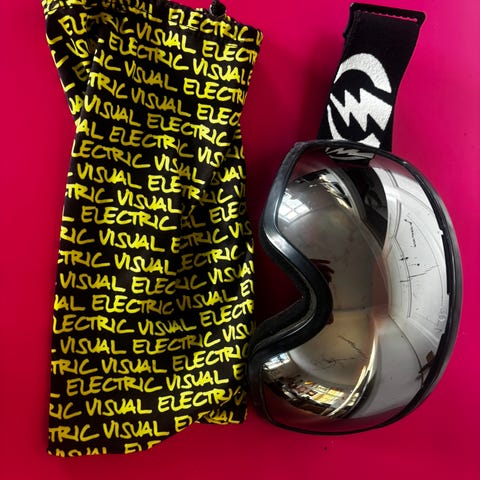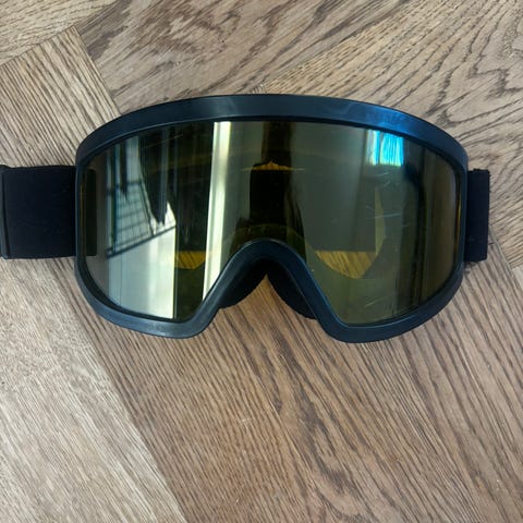 Der er ingen ridser i glasset. Rem kan indstilles, men det er en voksenmodel. Den er sort med orange glas. Leveres i pose, der også kan bruges som pudseklud.