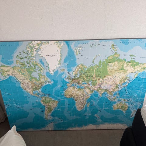 Super smukt verdenskort på lærred i beige, som vi desværre ikke længere har plads til.