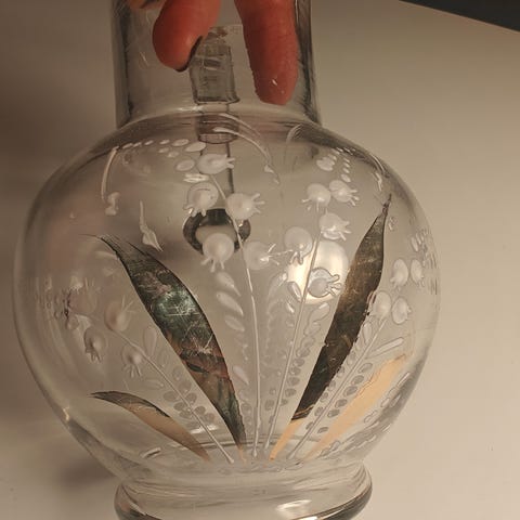 Flot antik vandkaraffel - lys blå- Mary Gregory design - emaljedekor , pige i guldkjole,med blomster- anhæftet ( knæk ) under bund - højde 18 cm.- PRIS kun 195 kroner afh. i Herning + evt. forsendelse ??