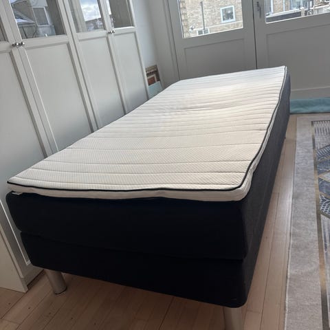 Jysk seng med sort betræk og metalben