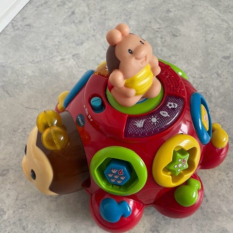 Legetøj formet som en bi, hængende i en snor. Fremstillet i træ med detaljer i sort, gul og hvid farve. Egnet til ophængning som dekoration eller ophæng over puslebord