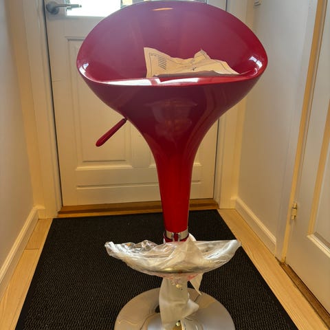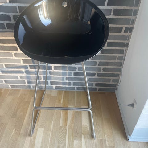 Detroit Barstol med sort sæde i plastmateriale og stel i krom. Stolen har en moderne design med høje ben og fodstøtte. Sædet har to små huller foran, men ellers er stolen i pæn stand.