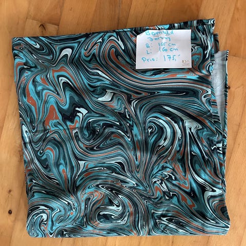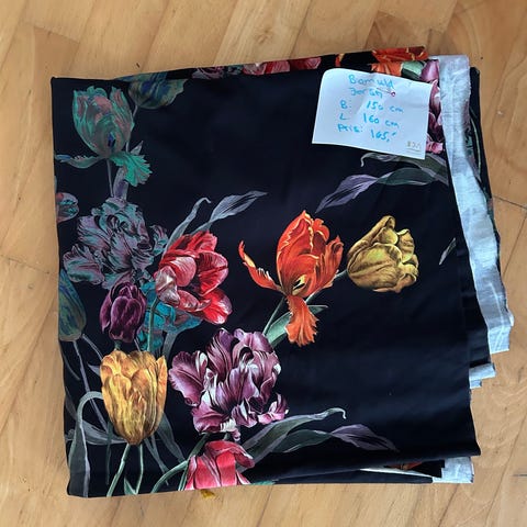 Stof med blomsterprint i pink og rød på sort bund mål stor på den lille lap