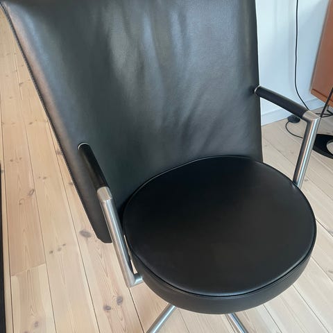 6 stk. Flotte, Ikoniske Ej-80 partnerstole. Stolene er polstret i Mørkeblåt slidstærkt stof med lysere blå nister. Stolene stammer fra Danske banks gamle hovedsæde på Holmens kanal.