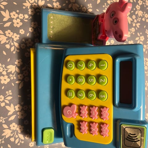 Gurli Gris legetøj kasseapparat med knapper, display og tilbehør som legetøjspenge og kort. Designet til børn til rolleleg og læring af kassefunktioner. Der er medfølger lomme regner og legetøjspenge