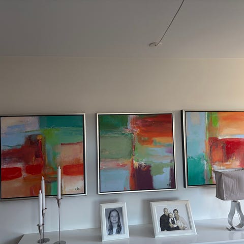 Mette Skov maleri med abstrakt motiv. Kunstværket indeholder forskellige farver og former, Maleriet er egnet til indretning og dekoration.