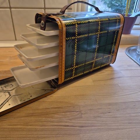 Se alle billeder for stand. Den har noget patina og brugsspor,men stadig en fin madkasse. Brug den som den er, eller fiks den op. Fin til veteranbilen.