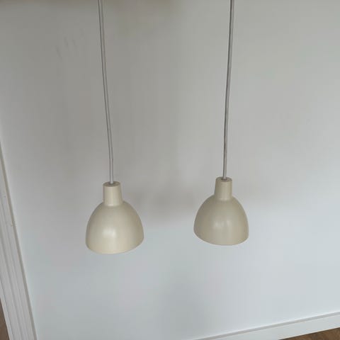 Sælger to Tolbod 120 pendler i farven “misty blue”. De lilla stofledninger er hhv. 140 cm og 230 cm lange.