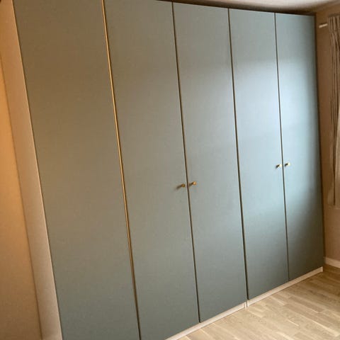 Sælger disse to selvbyggede Ikea pax skabe som er 2 år gamle. De er med i alt 3 skuffer, 6 hylder, en bøjle til 6 par bukser, en bøjlestang og lys med tilhørende fjernbetjening. Nypris er 3116kr som vist på billedet. Der er skåret et lille hul nederst i den ene skab grundet ledningudtræk. Prisen er samlet for begge skabe.