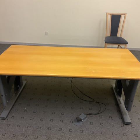El Justerbart hæve-sænkebord med træbordplade og metalstel. Velegnet til værksteds- kontor brug med mulighed for at tilpasse bordhøjden efter behov.