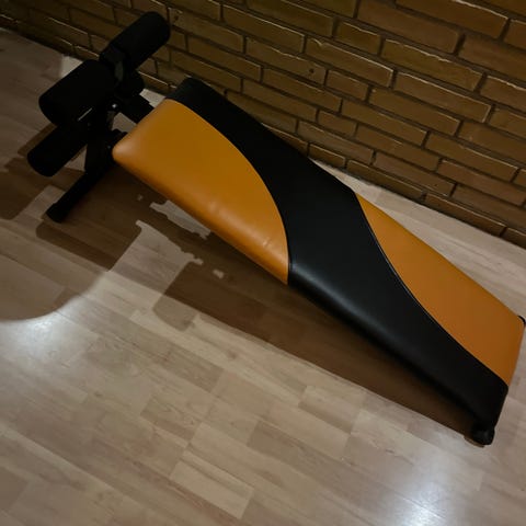 Måler 118cm i længden og ca. 43cm i højden. Stoffet i bunden er mørnet og falder af, men selv bænken fejler ikke noget.