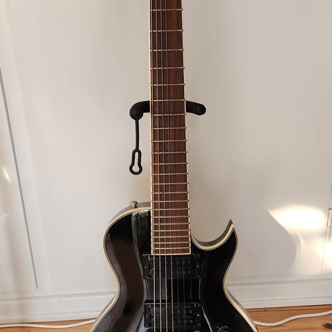 Flot venstre hånds Ibanez guitar med floyd rose tremolo system, der tillader avanceret bar-brug på guitaren.