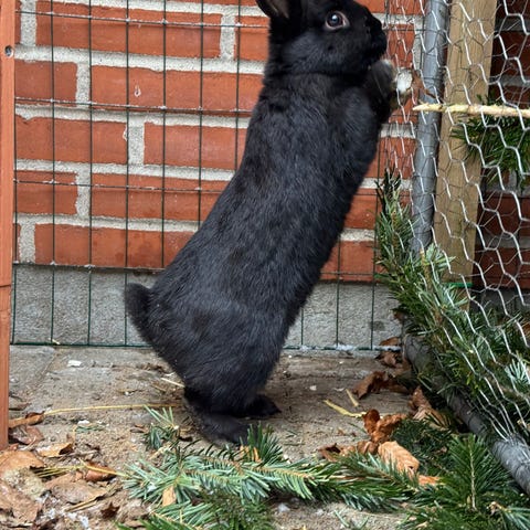 Hun hedder Vera bor ude hele året, men ville kunne flyttes ind til foråret, hvis man ønsker at gøre hende til indekanin. Hun er meget nysgerrig, men ikke så tam længere. Kan håndfodres