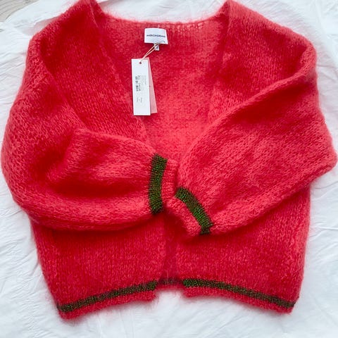 Cardigan fra American Dreams i hindbær rød. Brugt 1 gang og fremstår som ny.