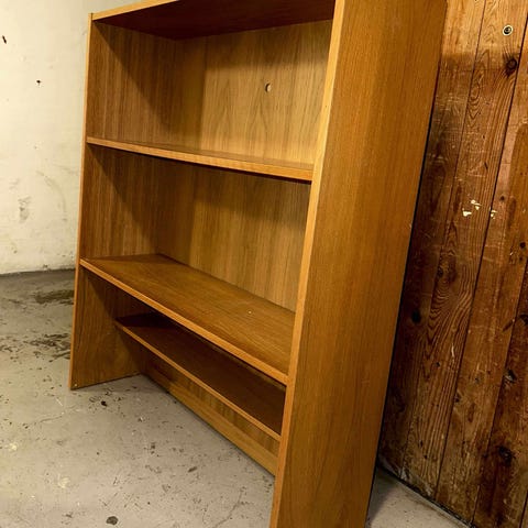Flot stor reol i eg i flot design. Står flot med naturlige brugsspor og patina. Der er lys i bunden.