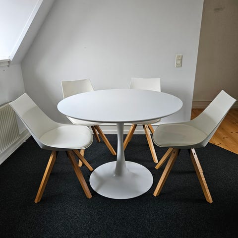 Hvidt spisebord med ekstra plade, så det både kan være rundt og mere aflangt.