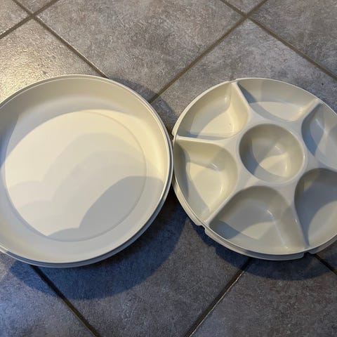Fint serveringsfad fra Tupperware, med marineblåt låg og kant. Enkelte brugsspor på bunden, men ellers i rigtig fin stand.
