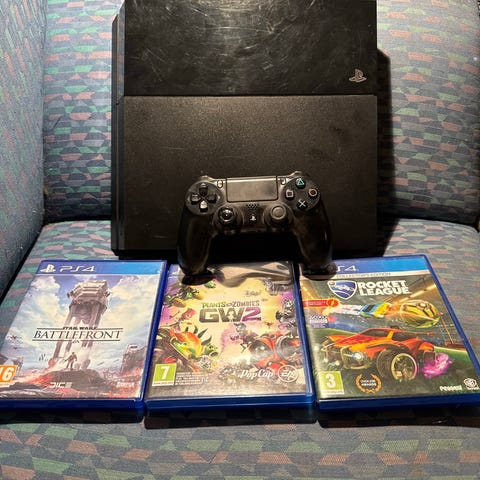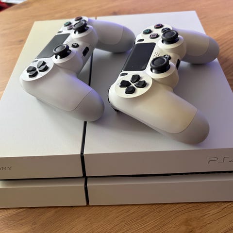 Sony PlayStation 4 spillekonsol med 2 originale controllere og et spil (Horizon Forbidden West). Hdmi, strøm og controller-lader laver medfølger, så det hele er klart til start.