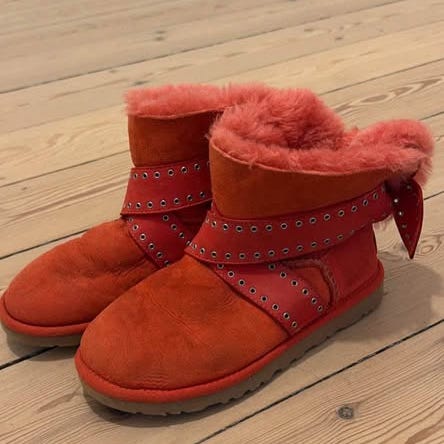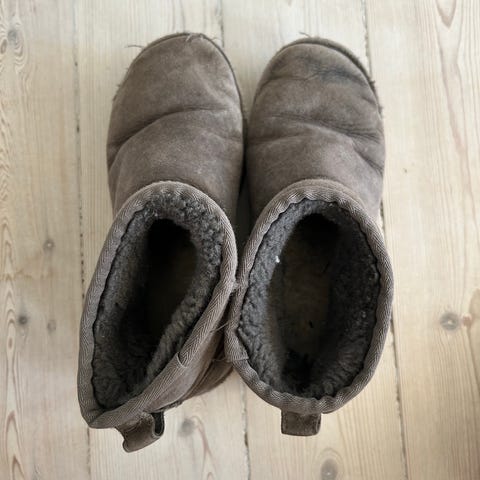 UGG vinterstøvler i størrelse 42, lavet af brunt ruskind med foret indvendigt for varme. Støvlerne er designet til at holde fødderne varme i kolde vejrforhold.