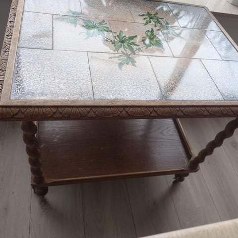 Sofabord med klinker på bordpladen og to skuffer til opbevaring. Bordet har træben og en rektangulær form. Fliserne på bordpladen er i forskellige blå, brune og grønne nuancer. Bordet kan anvendes som et funktionelt møbel i stuen til opbevaring og som bordoverflade.