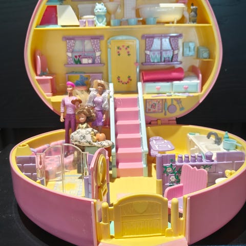 Polly Pocket legehuse sæt bestående af fire forskellige designs i farver som gul, lyserød, mintgrøn og lilla. Hvert legehus åbner op til detaljerede miniaturerum med møbler og indretning. Sættet inkluderer et hus formet som et traditionelt hus, et blomstret hus, et rundt hus og et ovalt hus. Materialet er plastik, og produkterne er egnet til børn.