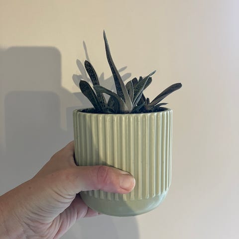 Sukkulent i hvid krukke med brune blomster på, med en revne. Plantet kan blive kæmpe lang hvis man lader stænglerne gro, men man kan klippe dem den længde man vil.
