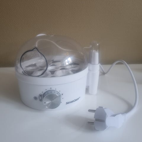 Æggekoger i hvid plast med kapacitet til flere æg. Har gennemsigtigt låg og et målebæger til vand, som sikrer korrekt kogning.