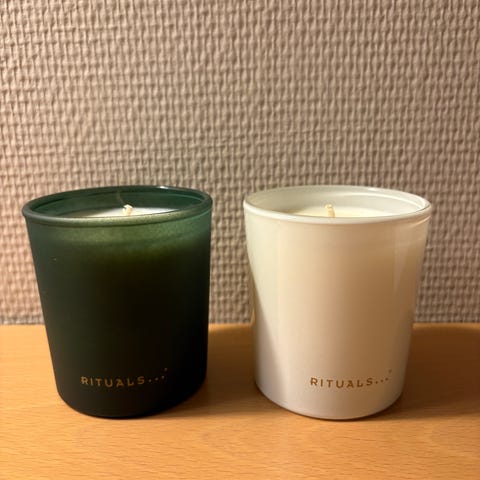 Rituals duft flaske og lys kop. Begge dele tomme. Flasken er er tømt og lagt i kassen igen, med pinde. Lys er brændt og koppen renset.