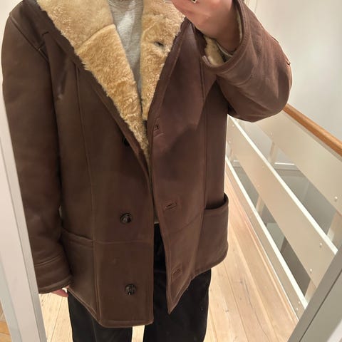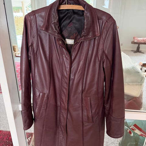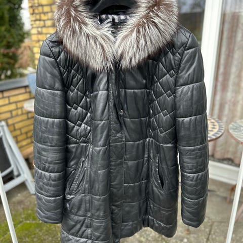 Brun læder vinterjakke til kvinder i størrelse 36 (stor i størrelsen 38-40). Jakken har en varm foring og hætte, designet til at give isolering mod kulde. Materialet er ægte læder, hvilket giver jakken holdbarhed og en klassisk stil.