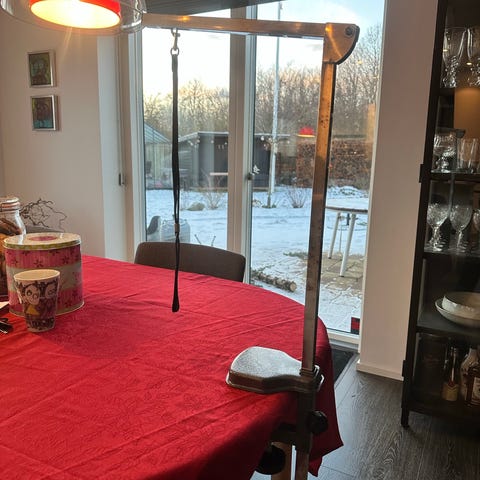 Højde 90cm, justerbar, tværstang 40cm , til montering på bord. God kraftig kvalitet