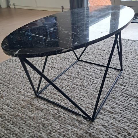 Bord med bordplade i marmor og stel i sort metal. Bordpladen har en let ru marmoreret overflade med forskellige grå og hvide nuancer. Den ru overflade gør bordet praktisk og nemt at vedligeholde. Stellet er robust og har et enkelt, buet design. Bordet er fra C&C Marmorhuset. Vi sælger bordet, fordi det er blevet for tungt for os at flytte rundt med.