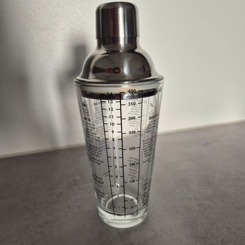 Shaker til cocktails eller vinaigrette. Fremstår som ny i glas og metal, og måler 23 cm.