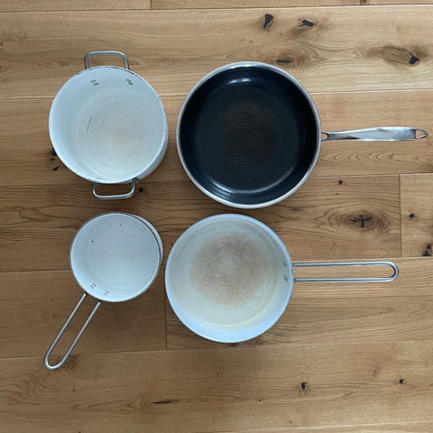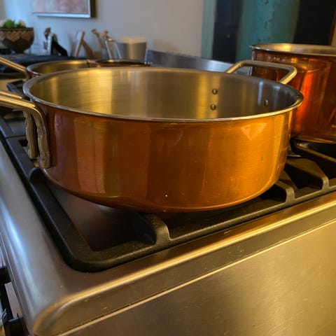 Gryderne og særligt panden er brugte og fremstår med tydelige brugsspor og naturlig patinering på kobberets yderside - kan rengøres og pudses op. Indvendigt er de fuldt funktionelle og velegnede til daglig brug.