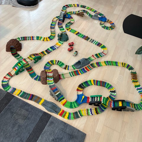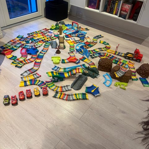 Flexi-Track bane med forskellige dele. Der medfølger 3 biler, men Lynet McQueen virker desværre ikke.