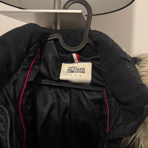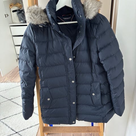 Tommy Hilfiger vinterjakke i blå farve, størrelse L til kvinder. Jakken er fyldt med dun, hvilket giver isolering og varme. Modellen har en hætte med pelskant og lynlås foran. Jakken er designet til vinterbrug og har en lang pasform.