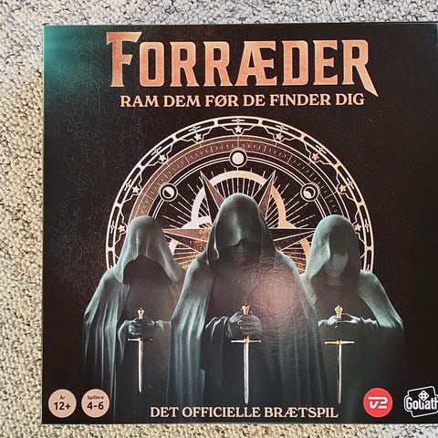 Forræder brætspil med tema om forræderi og strategi. Spillet er designet til 4-6 spillere og har en anbefalet aldersgrænse på 12 år og opefter. Det officielle brætspil inkluderer elementer som kort og brikker, der understøtter spillets tema og mekanik.