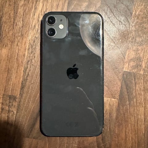 Apple iPhone 11 mobiltelefon med 64 GB lagerplads. Enheden har en sort farve og leveres med tre forskellige covers i klar, pink og brun farve.