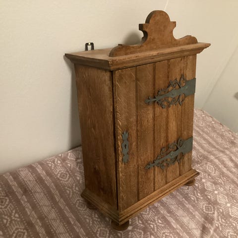 Massivt fyrretræ, originale hylder, lås/slå og greb(det øverste greb mangler) original maling