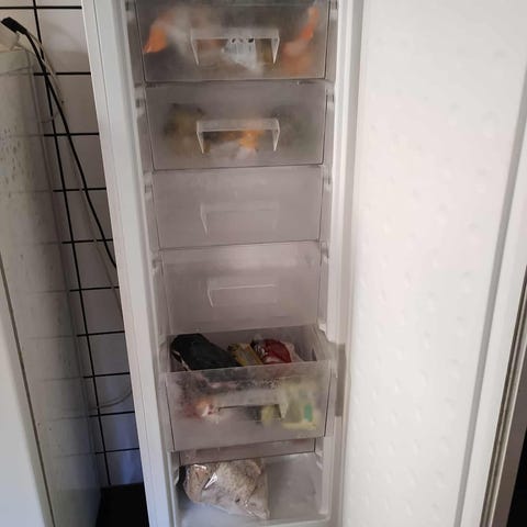 Der er nogle skrammer på døren samt én knækket skuffe og én manglende skuffe – dette kan ses på billederne. Udover de nævnte brugsspor er fryseren i fin stand.