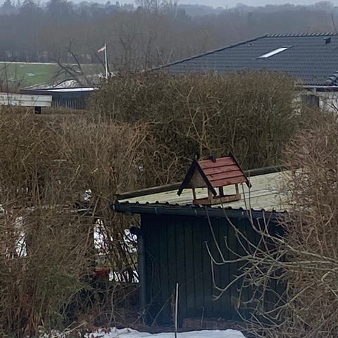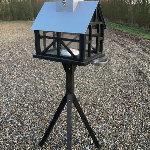 Håndlavet foderhus med "Græs" på taget og ryttere af egetræ for lang levetid. Det er nu vi skal hjælpe fuglene, så vil de kvittere til sommer.