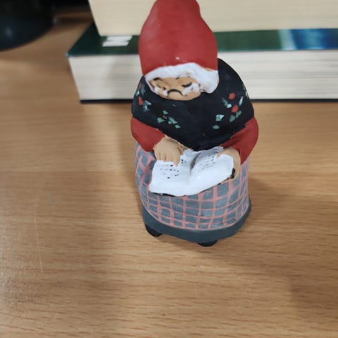 keramik figurer, to kvinder iført traditionelle dragter med detaljeret maleri. Figurerne viser kvinder med røde og blå farver, og hver figur er signeret på undersiden.