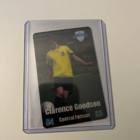 Johan Wiland fodboldkort med billede af målvagt i grøn trøje. Kortet indeholder informationer som navn, position (målvagt), og nationalitet. Kortet er indkapslet i plastik for beskyttelse.