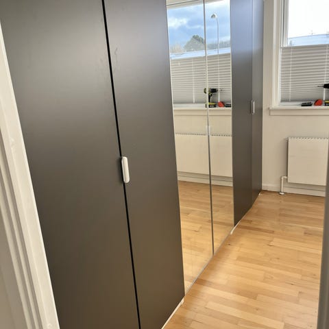 Super flot klædeskab hvor der ikke er sparet på detaljerne. Skabet er personligt designet. Der er skohylder i begge sektioner nederst. I den brede sektion er der en glashylde og under den en skuffe til f. eks. smykker mm., 3 store rummelige skuffer samt hylde foroven og masser af bøjleplads. I den smalle sektion er der 3 rummelige skuffer samt 4 hylder. Sælges grundet flytning. Flot stand men bagbeklædning er sprækket lidt (se billeder) Da skabet er brugt, vil det fremstå med små ridser hist og her. Ny pris 7.200 kr. Spørg hvis I vil vide mere. Skal skilles ad for at få ud af dør og ind i elevator. Jeg bor på 11. sal.