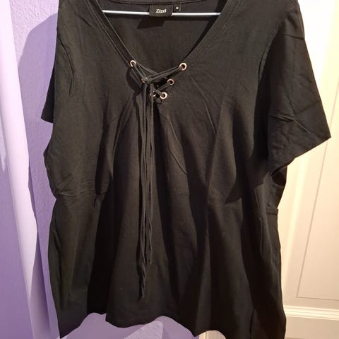 Zizzi bluse i størrelse M, sort farve, lavet af polyester. Blusen har et mønstret design ved halsudskæringen og korte ærmer, velegnet til kvinder.